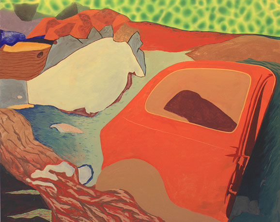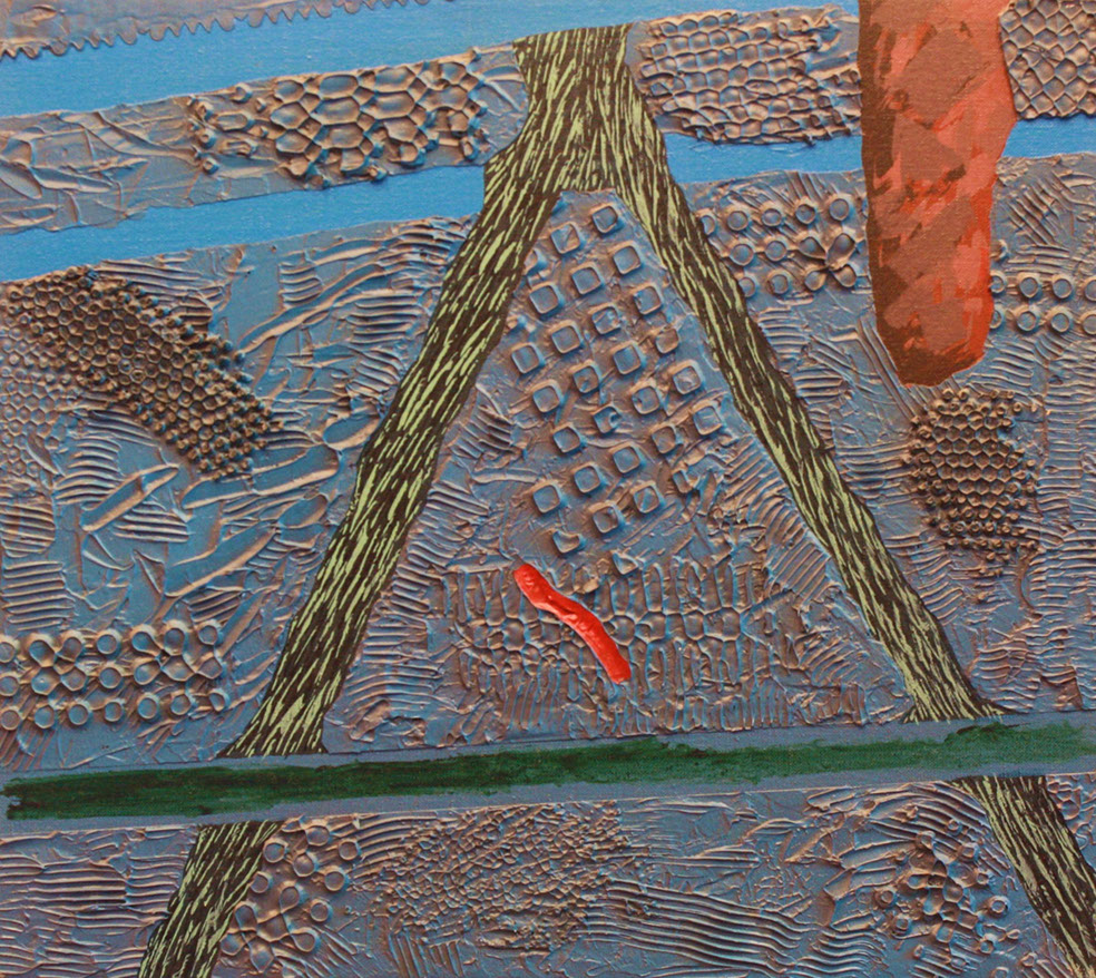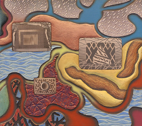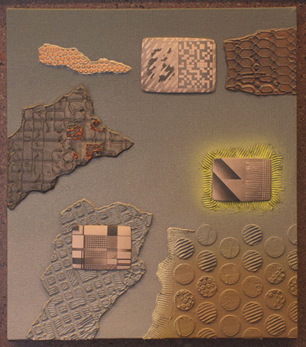 In the mid 90's, I began making low relief paintings, initially inspired by a vivid dream of mountainous textures of paint in relief with miniature TV screens embedded in the recesses. By spraying paint and squeegeeing molding paste through stencils onto the canvas, I was able to create a low relief painting of that vision, and then of others which followed. I continued to use imagery of the found object for the structural elements of these low relief paintings, keeping true to my vision of finding beauty in the ordinary, transforming the found object by abstraction.
