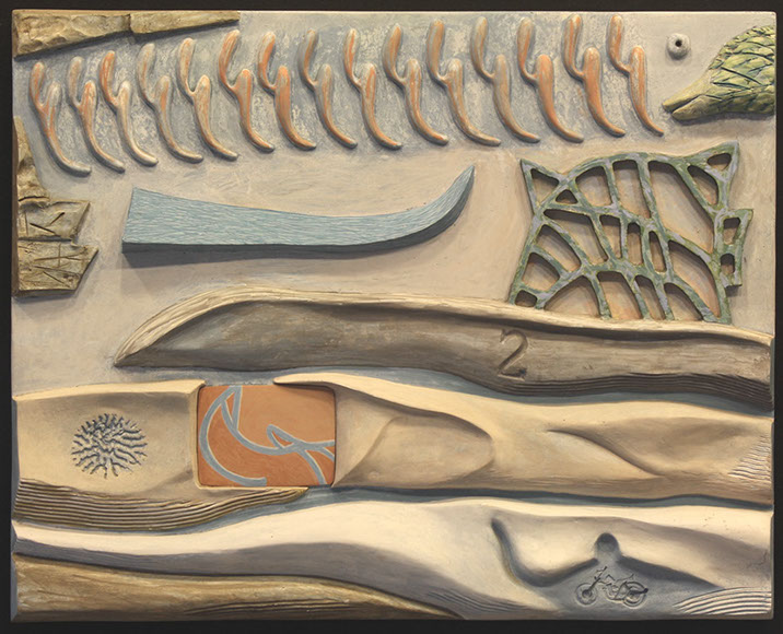 At a certain point I wanted higher relief than what I could get by using molding paste squeezed through stencils onto the canvas. By the end of the 90's I was using clay to make studies for higher relief pieces and was molding and casting the pieces, first in gypsum (design cast), and then in resin (aqua resin). I finished a piece by painting the final cast, using both brush and, sometimes, airbrush.