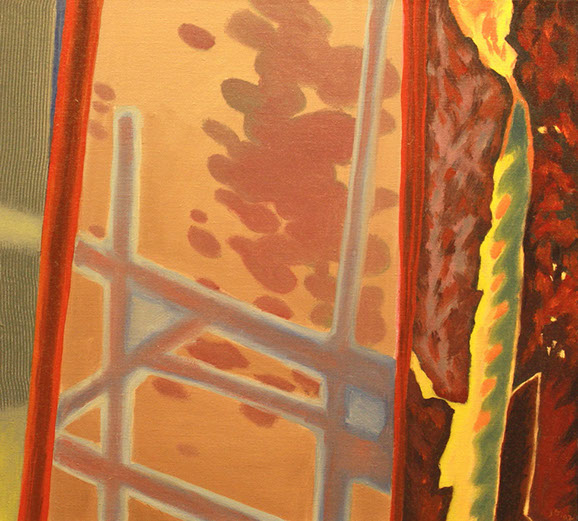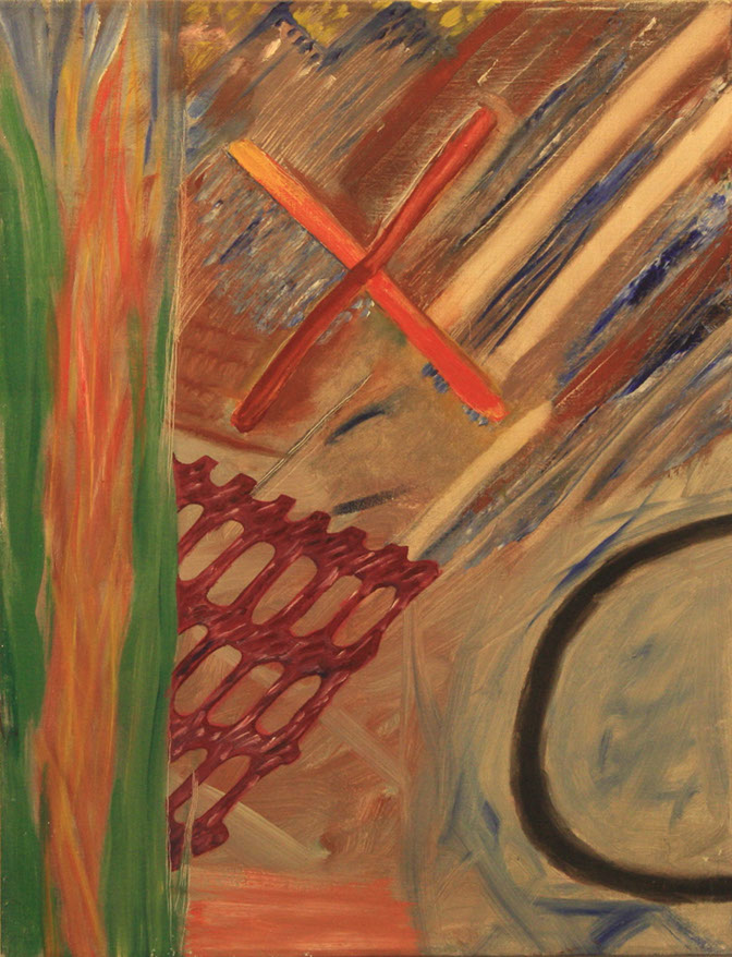 In the mid 90's, I began making low relief paintings, initially inspired by a vivid dream of mountainous textures of paint in relief with miniature TV screens embedded in the recesses. By spraying paint and squeegeeing molding paste through stencils onto the canvas, I was able to create a low relief painting of that vision, and then of others which followed. I continued to use imagery of the found object for the structural elements of these low relief paintings, keeping true to my vision of finding beauty in the ordinary, transforming the found object by abstraction.